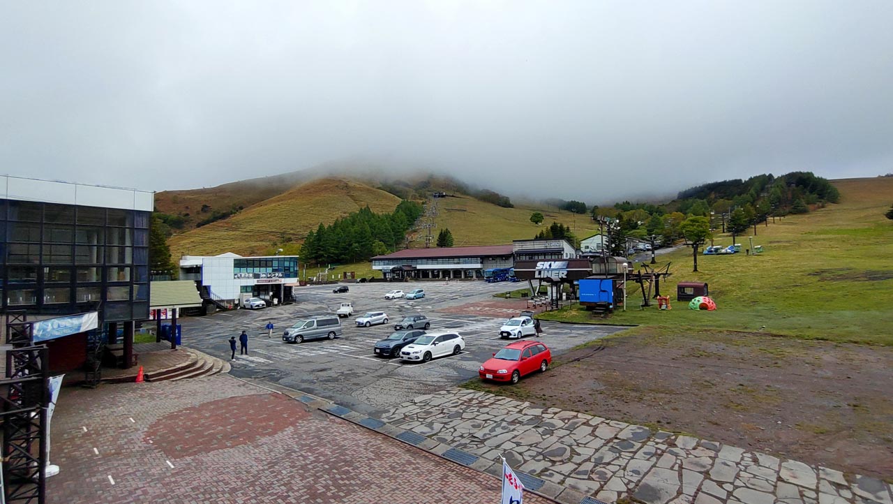 リフト乗場や売店などがある第一駐車場です。このくらい空いていればこちらの駐車場にも停められたかも知れません。リフトを2本乗り継いで山頂まで行けますがこの様子だと何も見えないでしょう。 Photo:N.A.