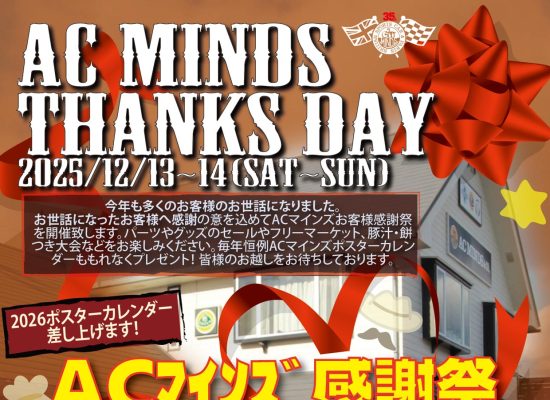 2025 AC MINDS THANKS DAY 12月13~14日(土~日)の日程で2025 ACマインズ感謝祭を開催いたします。 詳細はEVENT-2025 AC MINDS THANKS DAYをご覧ください。 ツイート « 入荷情報 2011 LOTUS ELISE SC
