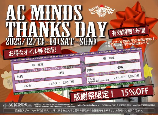 ACマインズ感謝祭は12/13~14開催! いよいよACマインズ感謝祭が近づいてまいりました。今年も好評のOIL券を販売いたします。他にもお楽しみ抽選会、シミュレーター大会などなど盛りだくさんのイベントを企画中です。お楽しみに! ツイート « 祝納車! LOTUS ELISE 111R