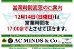 12月14日(日)のACマインズの営業時間は17:00までとさせていただきます。