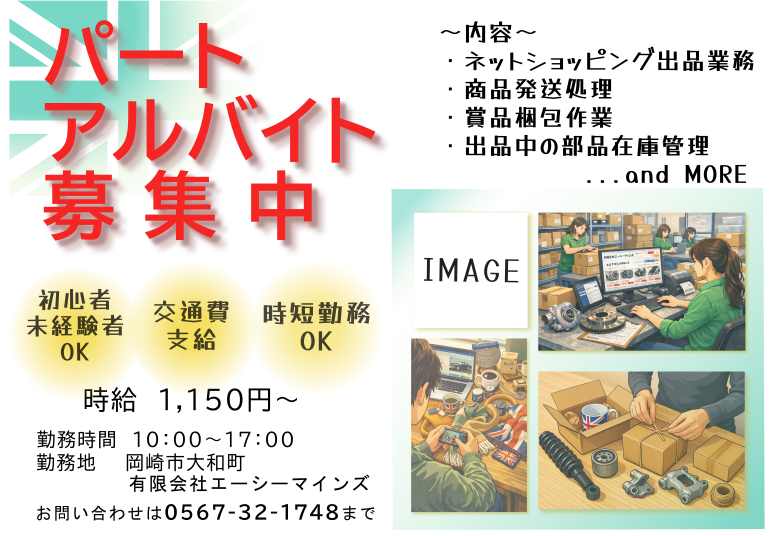 <応募資格/応募条件> 学歴不問 <業務内容>・英国車のパーツやグッズをヤフーショッピングで販売しています。サイトの管理、掲載、梱包から発送までの業務をお願いします。 主な業務は、▼商品情報の登録、更新・新規登録商品の撮影・YAHOO!ショッピングサイトに商品名、説明、価格、画像の登録・既にサイトに登録されている商品情報の更新▼在庫管理・パーツ倉庫内の在庫数を管理・不足のパーツや注文パーツがあれば発注の依頼▼注文処理(注文の確認、梱包、発送手配)・注文の確認や賞品に関するお問い合わせの確認(簡単な内容であれば返信もします)・発送品の梱包(大きいものから小さいものまで様々です)・運輸会社のシステムにて発送手配業務を行います*ご来店のお客様の接客もあります