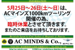 5月25~26日(土~日)はACマインズ1000kmツーリング開催の為、臨時休業とさせて頂きます。